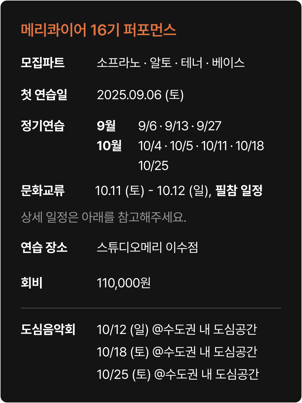 * 회비는 정기 연습과 최종 리허설 운영, 공연 운영을 위해 사용되며 파트별 개별적으로 진행되는 파트 및 안무 연습의 대관 비용 등은 포함되어 있지 않습니다.