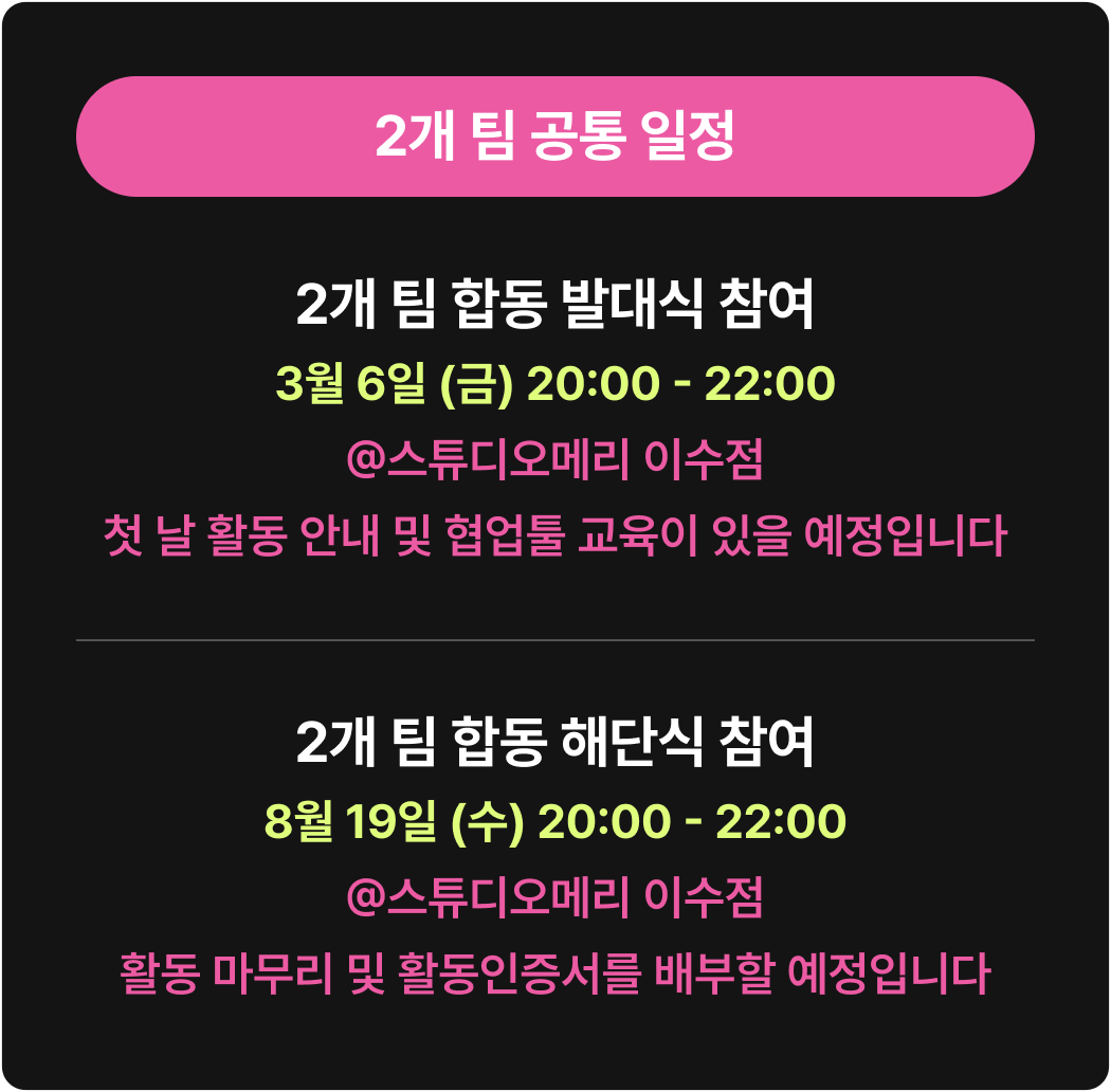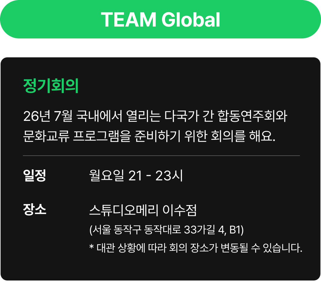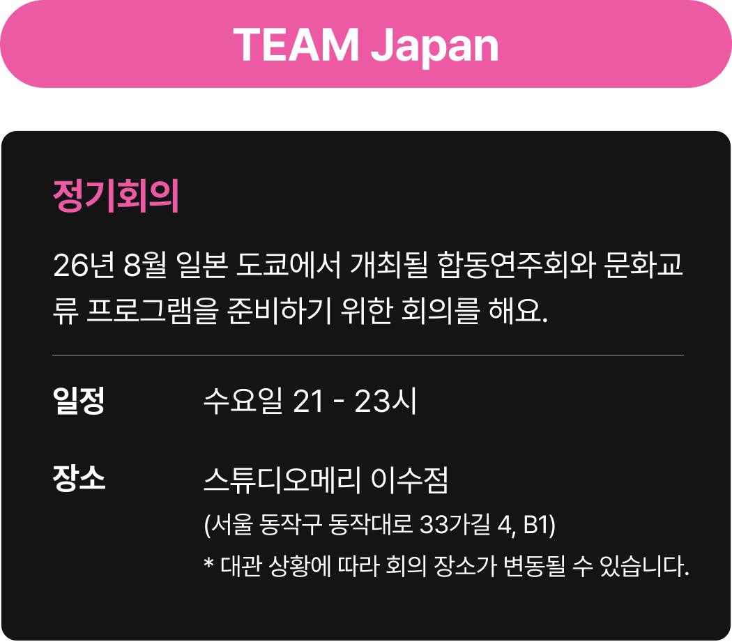 * 회비는 정기회의 및 협업툴 사용 등을 위해 사용되며, Photoshop 등 유료 프로그램에 대한 라이센스 비용과 해외 체류를 위한 경비는 포함되어 있지 않습니다.