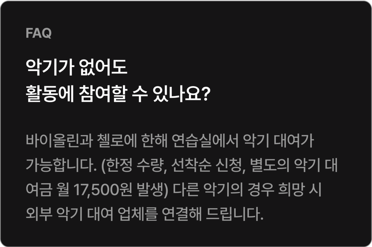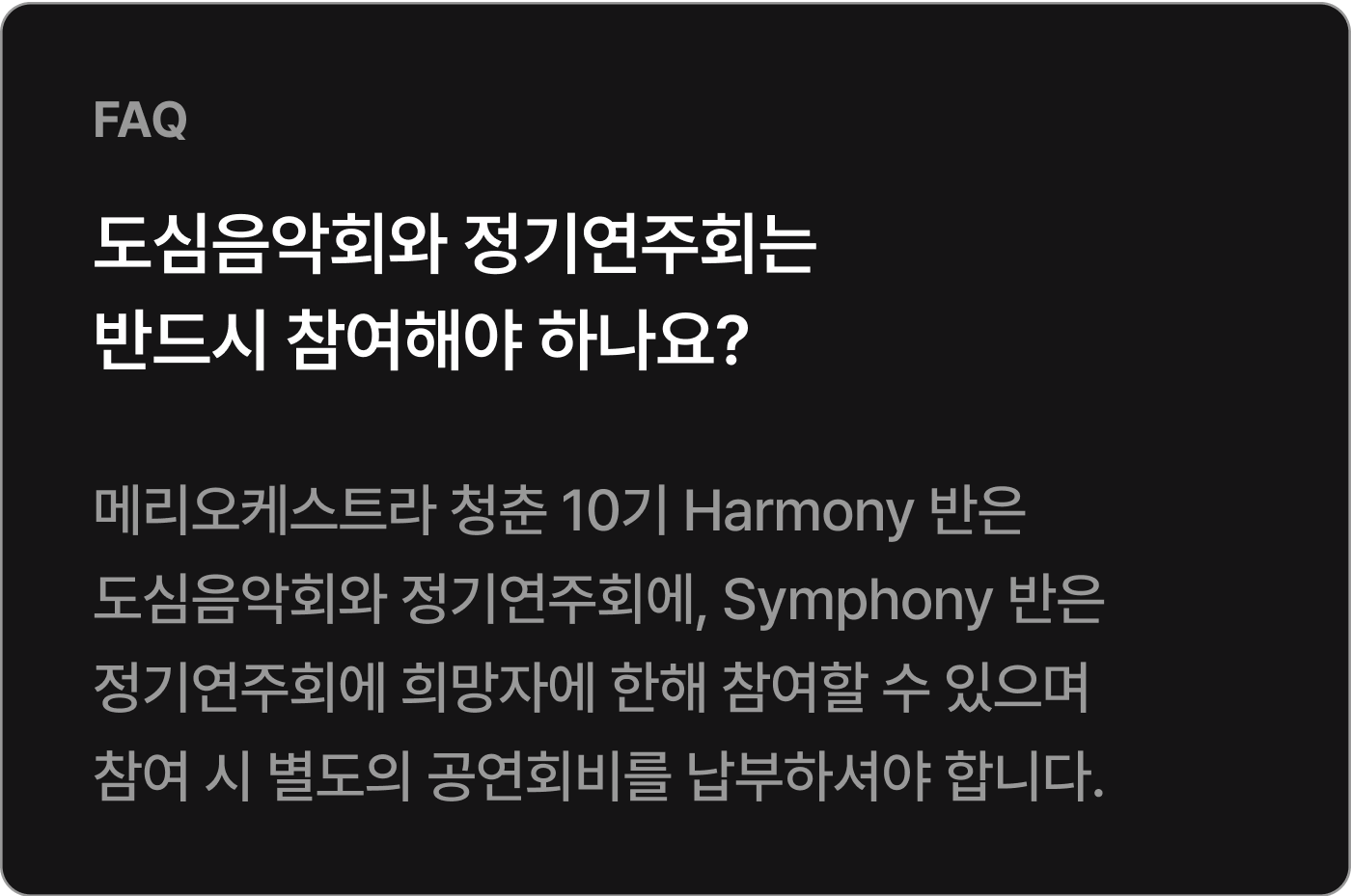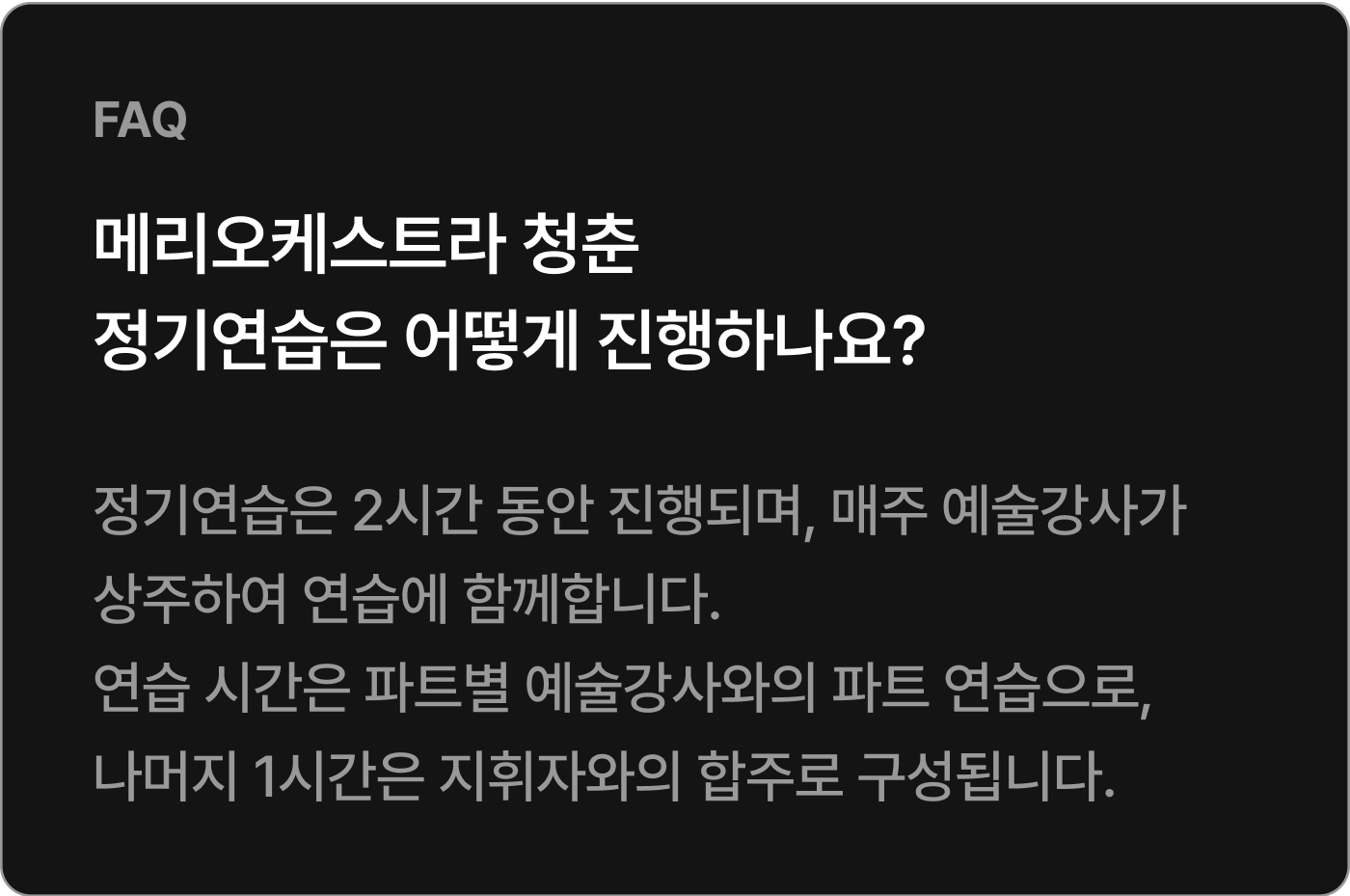 * 정기연습과 최종 리허설(총 20회)의 회비는 440,000원입니다.