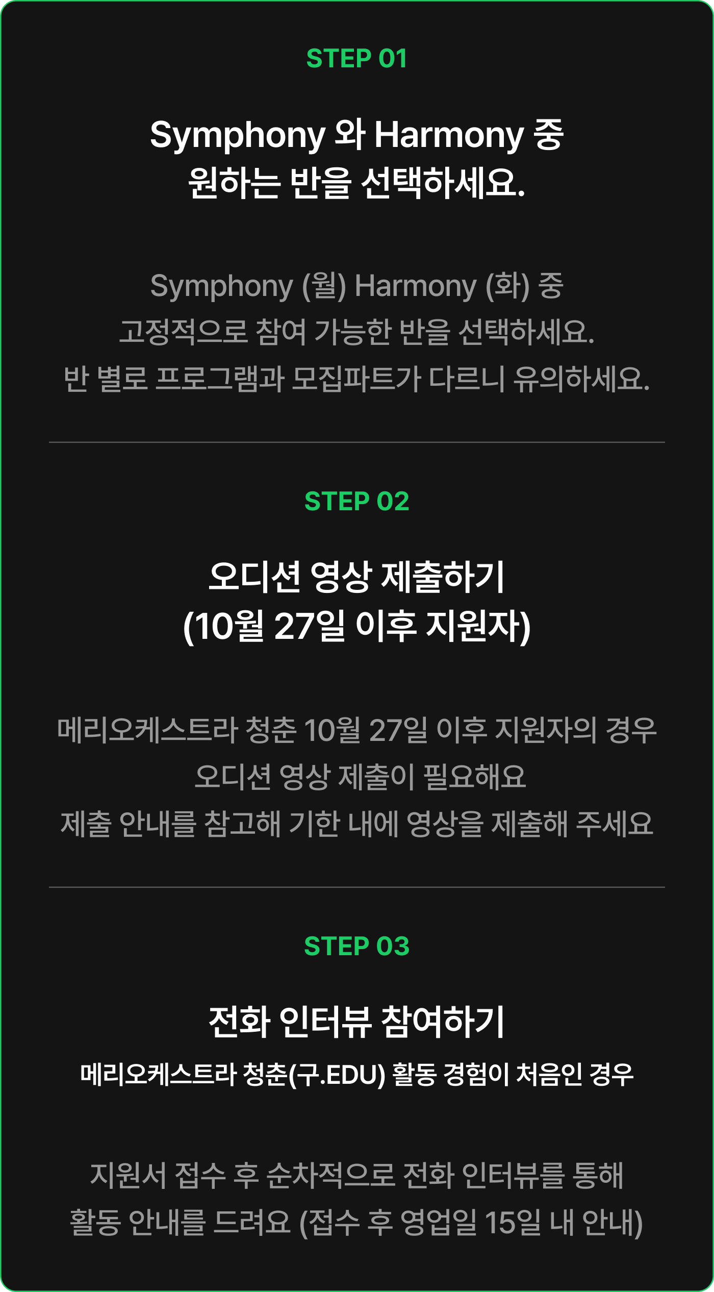 * 회비는 정기 연습과 최종 리허설 운영을 위해 사용되며, 파트별 개별적으로 진행되는
