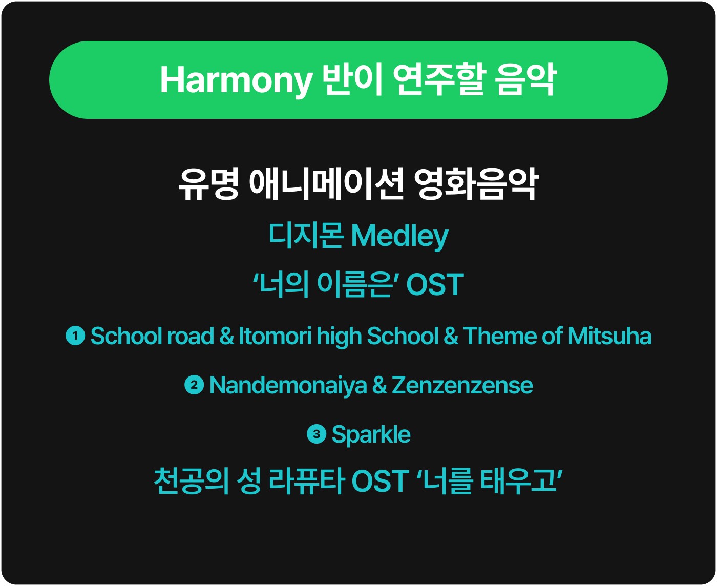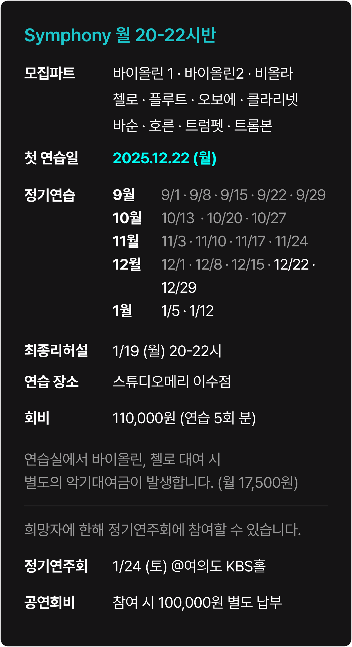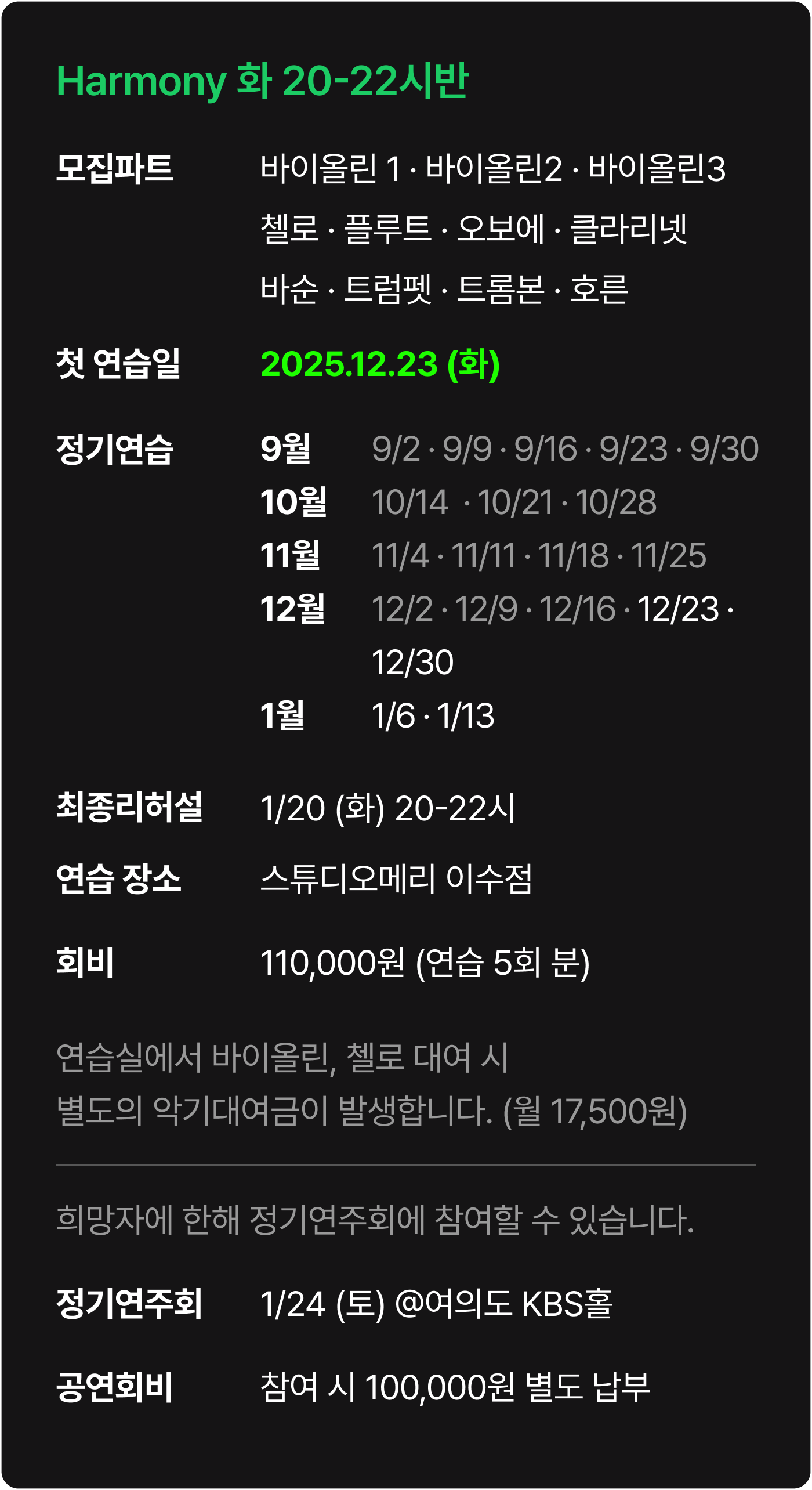 * (12월 중간 입단자) 정기연습과 최종 리허설(총 5회)의 회비는 110,000원입니다.