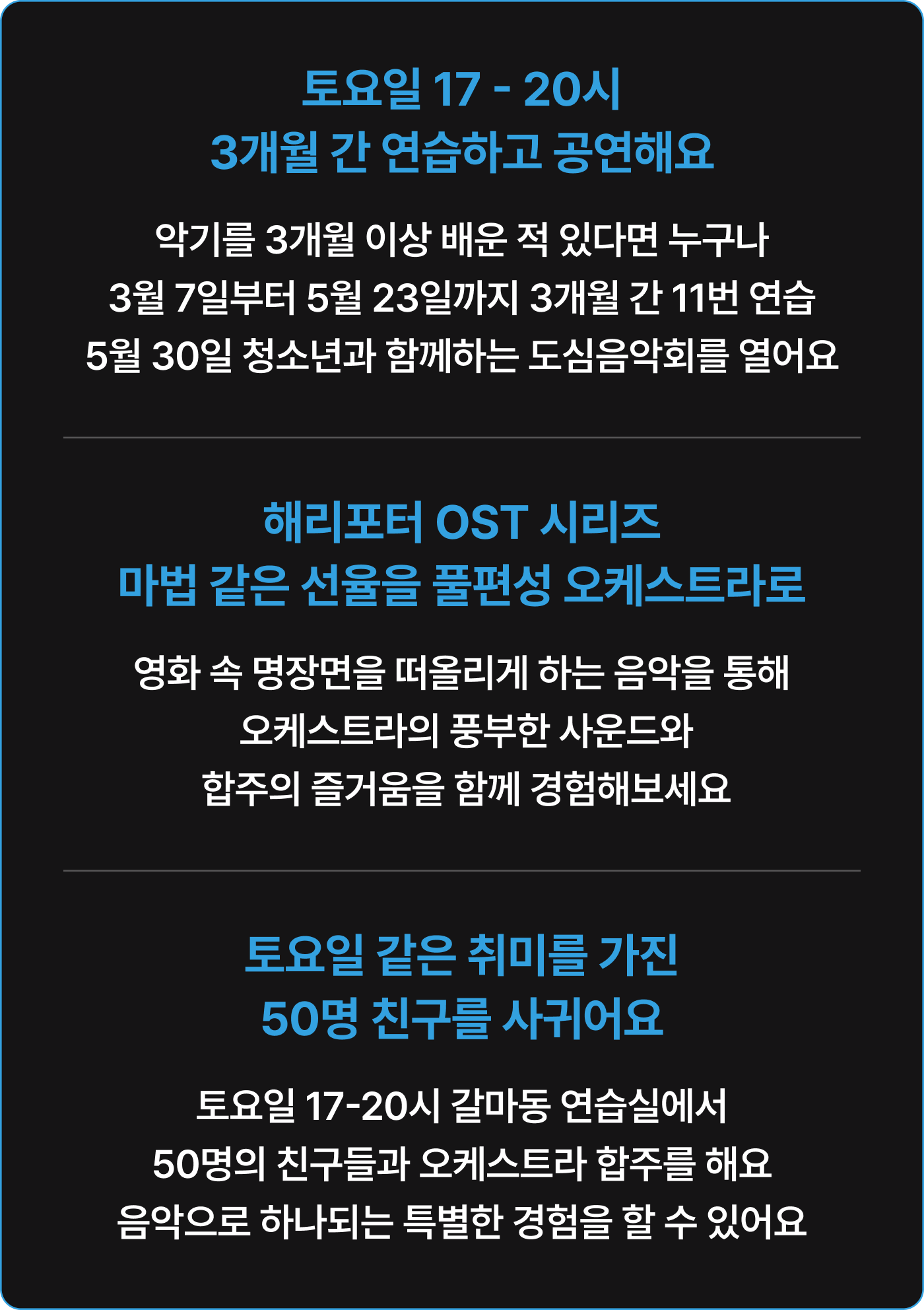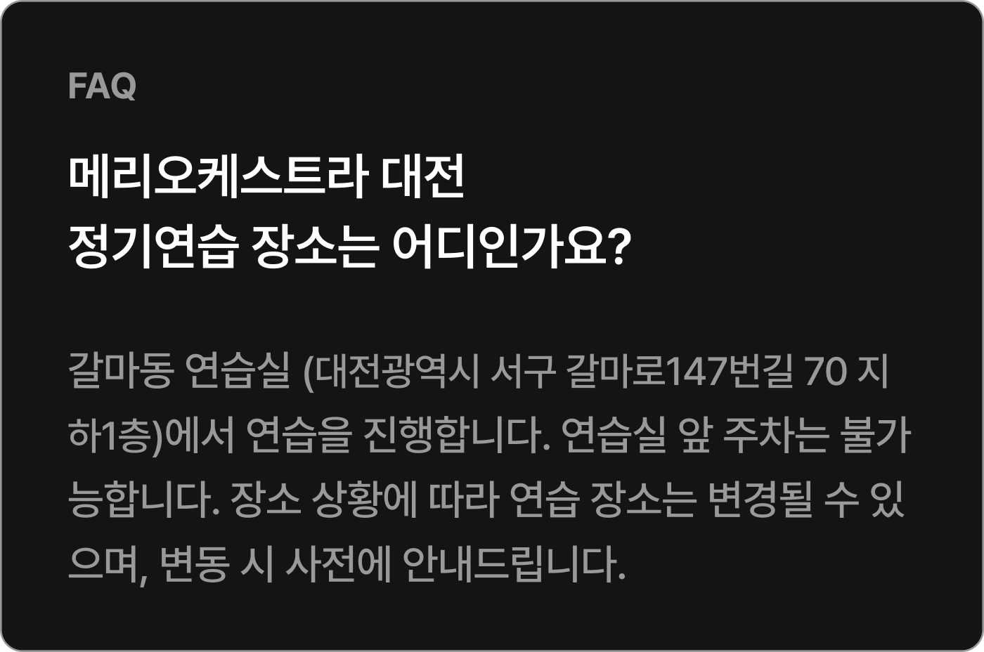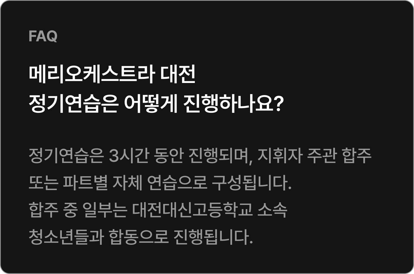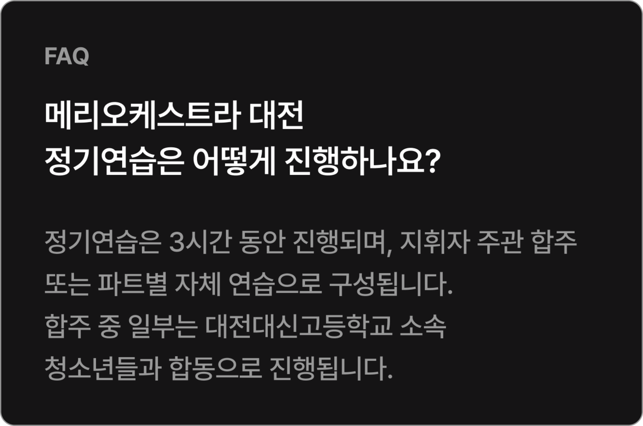 * 회비는 정기연습과 최종 리허설 운영, 공연 운영을 위해 사용되며 파트별 개별적으로 진행되는 파트 연습의 대관 비용 등은 포함되어 있지 않습니다.