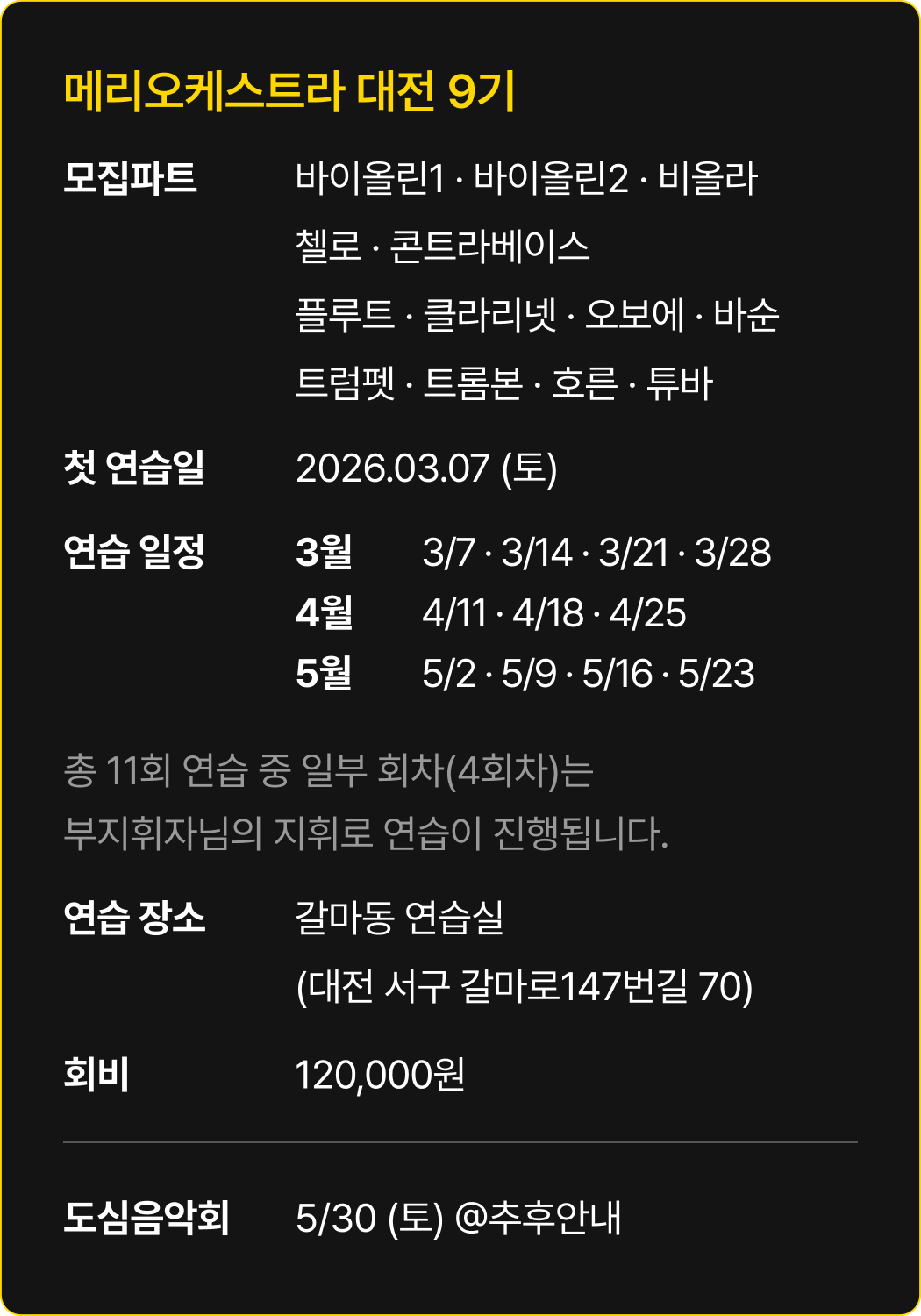 * 메리오케스트라 대전 9기 회비는 120,000원입니다.