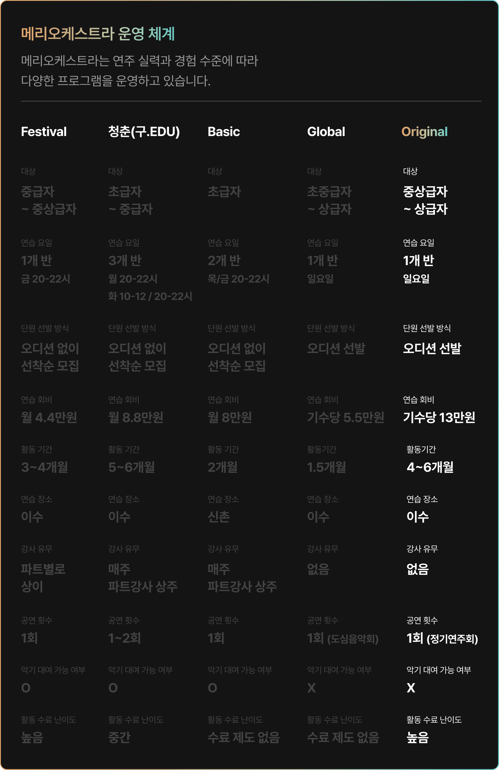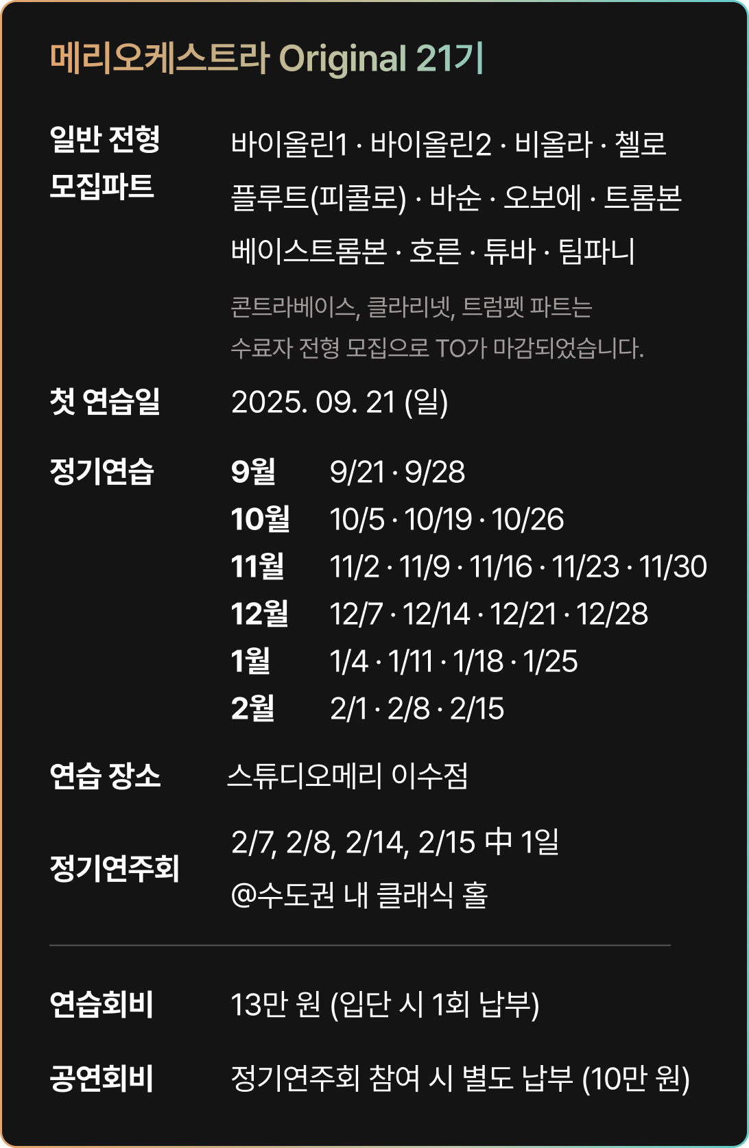 * 2025년 하반기 메리오케스트라 Global WITH TOKYO 와 중복 활동 시, Original 21기 연습 회비 (130,000원)가 면제되며 정기연주회 참여를 위한 공연회비 (100,000원)만 납부하시면 됩니다.