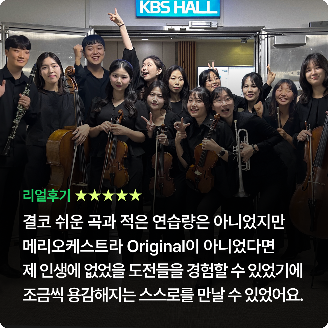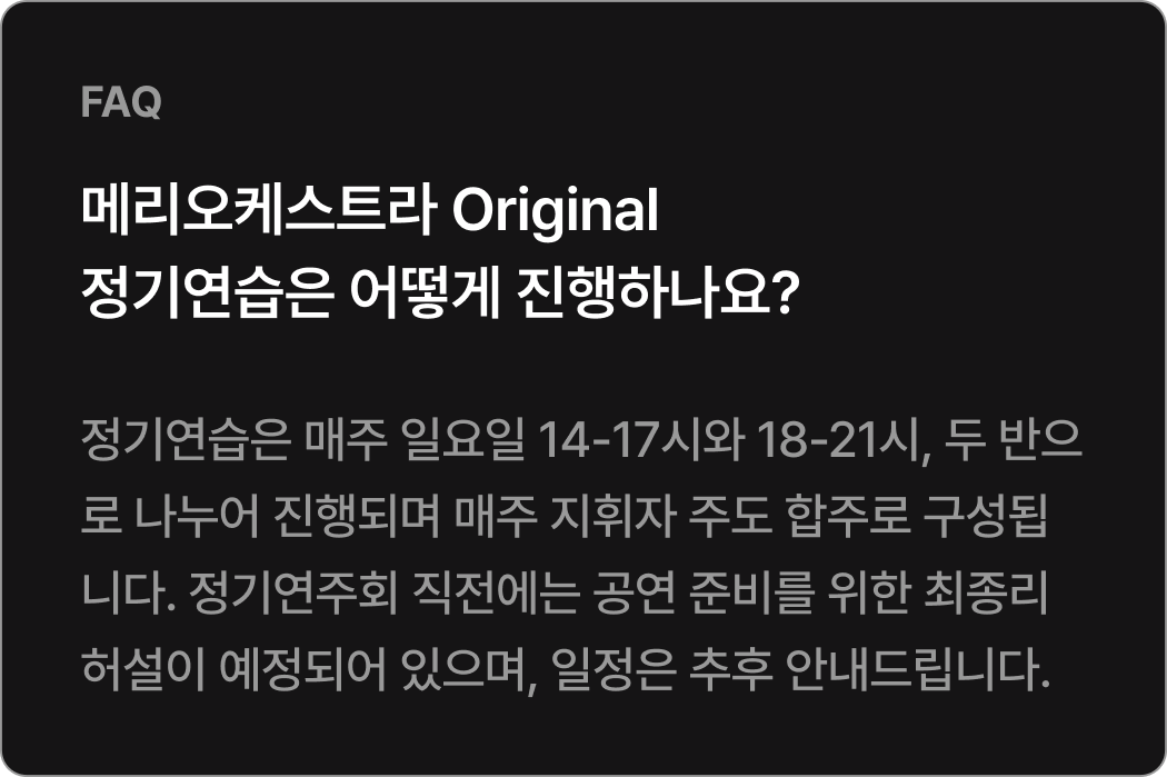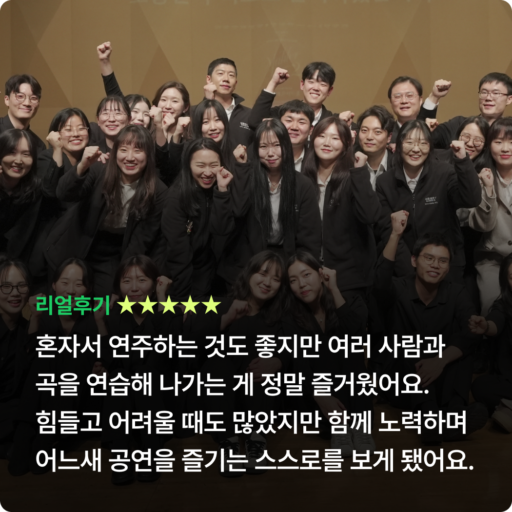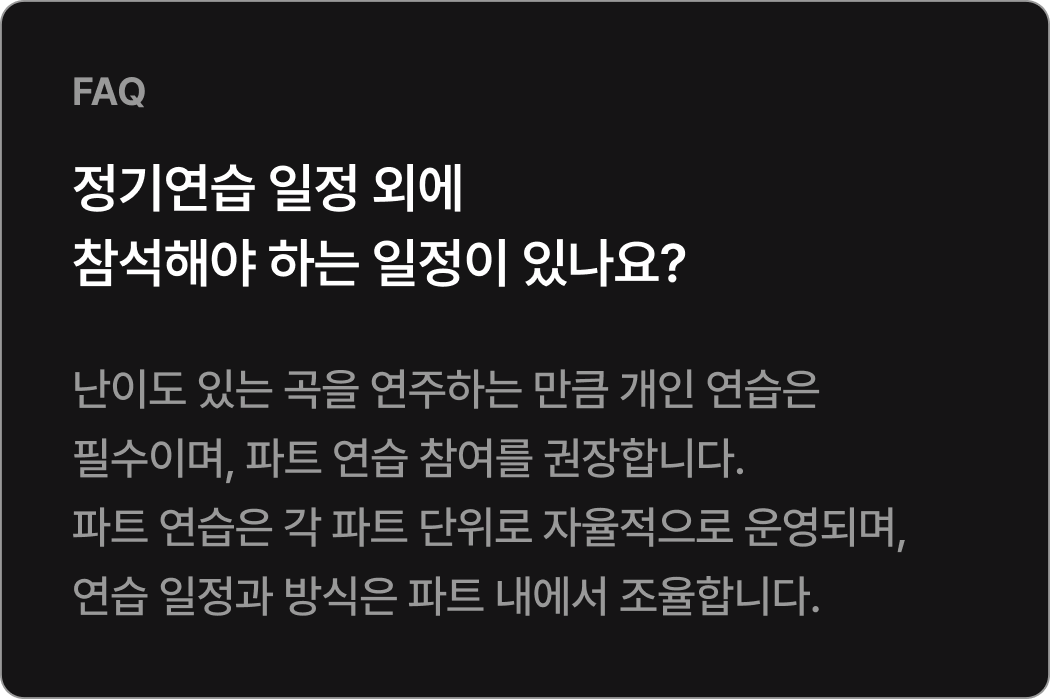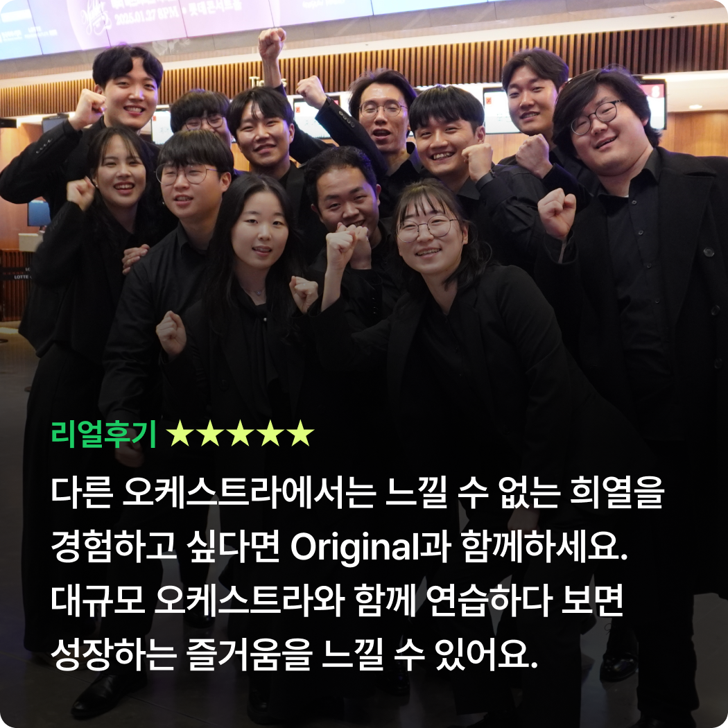 Orignal 22기 공연 참여기준 참여 기준 [현악, 관악] 정기연습 60% 이상 참여 시* 발대식 제외 정기연습 총 10회 중 6회 이상 참석[타악] 정기연습 50% 이상 참여 시* 발대식 제외 정기연습 총 10회 중 5회 이상 참석 정기연주회에 참여하기 위해서는 최소 출석 기준을 충족해야 하며, 기준 미달 시 무대 참여가 제한됩니다.상세 출석 기준 및 정책은 첫 연습에서 안내할 예정이며, 그 이전에는 별도 안내하지 않습니다.