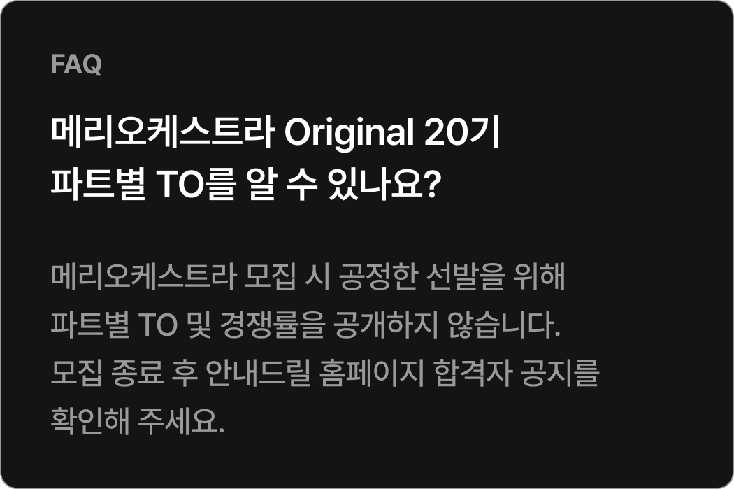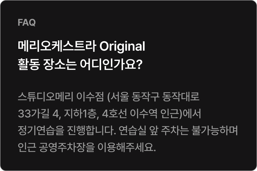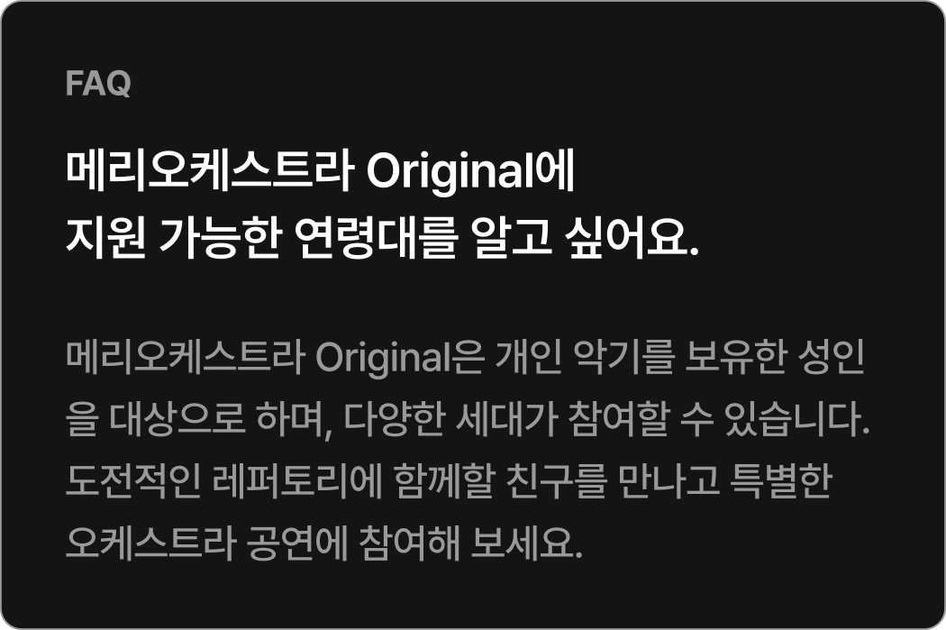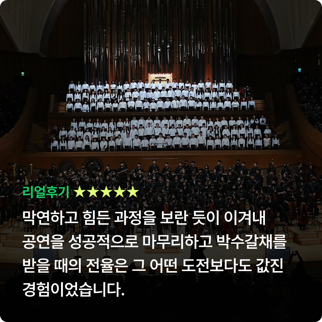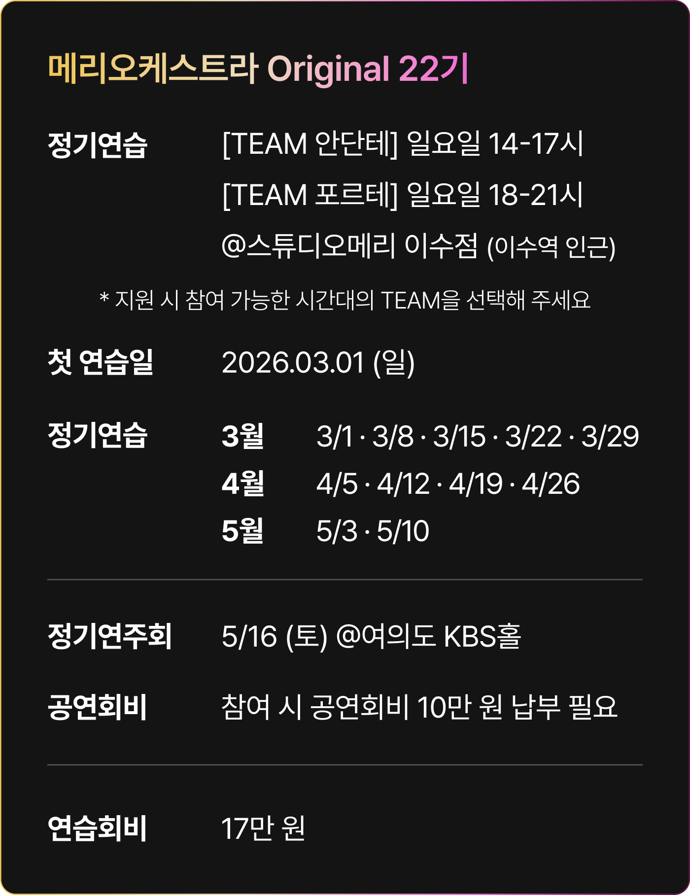 Orignal 22기 공연 참여기준 참여 기준 [현악, 관악] 정기연습 60% 이상 참여 시* 발대식 제외 정기연습 총 10회 중 6회 이상 참석[타악] 정기연습 50% 이상 참여 시* 발대식 제외 정기연습 총 10회 중 5회 이상 참석 정기연주회에 참여하기 위해서는 최소 출석 기준을 충족해야 하며, 기준 미달 시 무대 참여가 제한됩니다.상세 출석 기준 및 정책은 첫 연습에서 안내할 예정이며, 그 이전에는 별도 안내하지 않습니다.