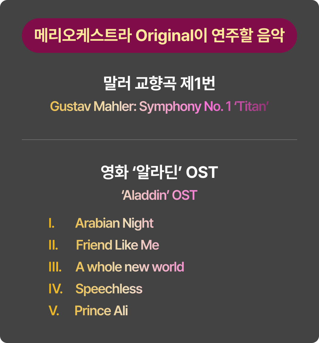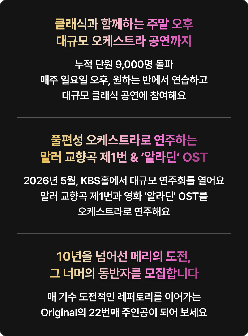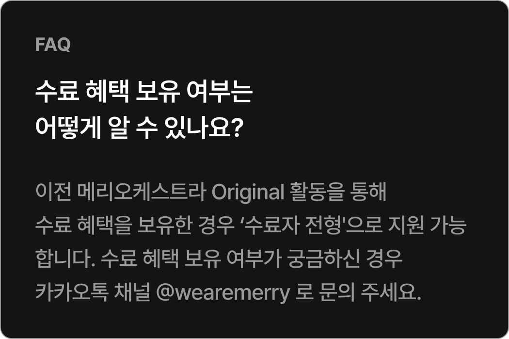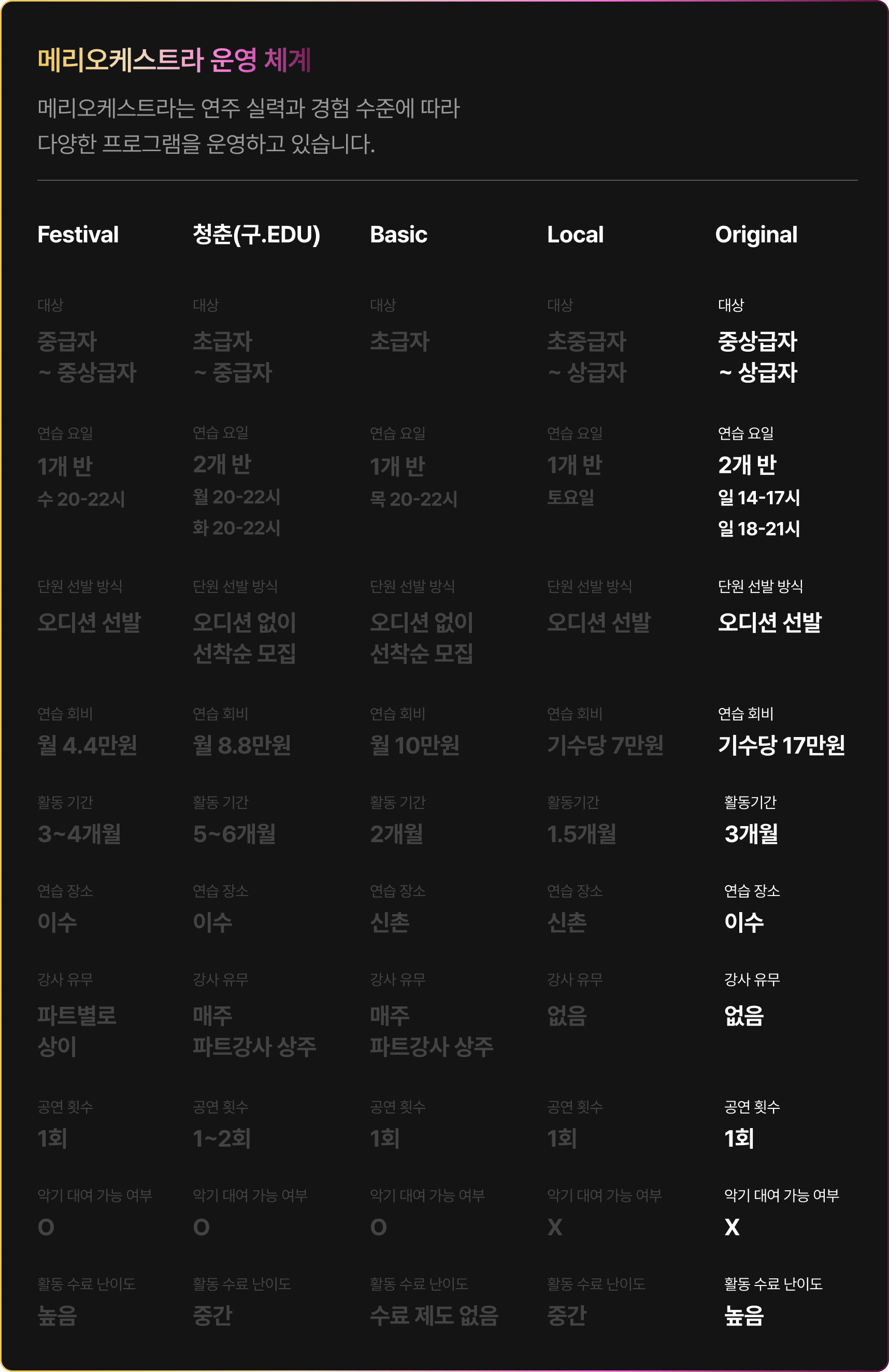 Orignal 22기 공연 참여기준 참여 기준 [현악, 관악] 정기연습 60% 이상 참여 시* 발대식 제외 정기연습 총 10회 중 6회 이상 참석[타악] 정기연습 50% 이상 참여 시* 발대식 제외 정기연습 총 10회 중 5회 이상 참석 정기연주회에 참여하기 위해서는 최소 출석 기준을 충족해야 하며, 기준 미달 시 무대 참여가 제한됩니다.상세 출석 기준 및 정책은 첫 연습에서 안내할 예정이며, 그 이전에는 별도 안내하지 않습니다.